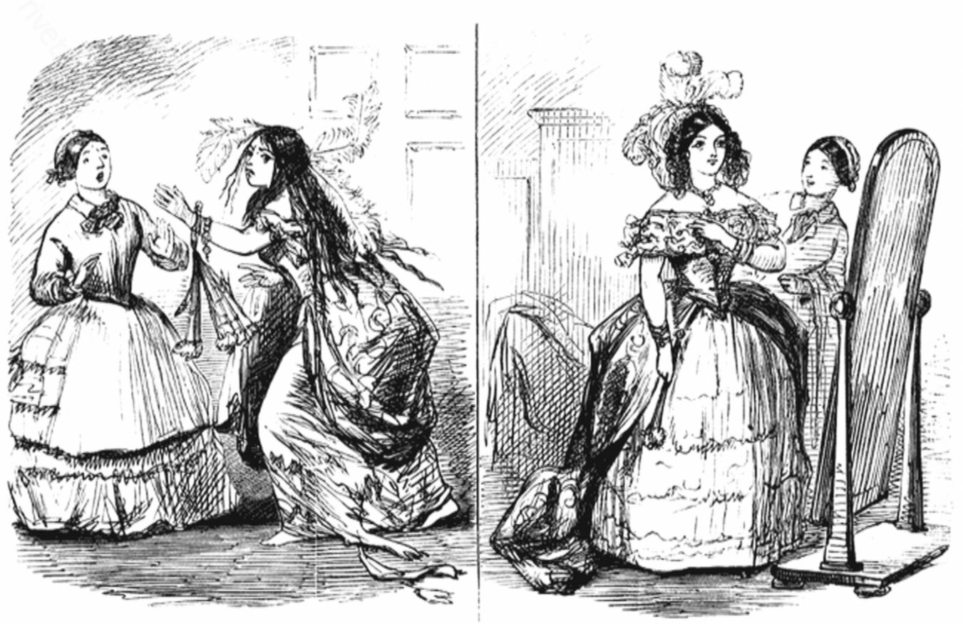 В 1853 году в еженедельном английском журнале «Punch» опубликовали карикатуру: девушка до поездки в королевский дворец, и после. На первой картинке весёлая модница смотрится в зеркало. На второй – она же – в крайне потрепанном виде. Что произошло?