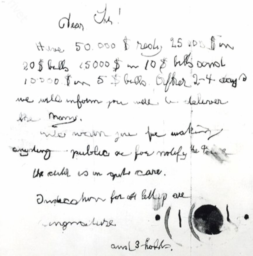 При осмотре комнаты, из которой был похищен ребенок, на подоконнике сам Линдберг обнаружил конверт со следующим обращением: «Уважаемый сэр! Имейте 50 000 $, из них 2 000 $ – в 20 $ банкнотах, 1 500 $ – в 10 $, 1 000 $ – в 5 $ банкнотах. Мы сообщим, где Вы должны будете оставить деньги. Мы предупреждаем, чтобы Вы ничего не сообщали публике и не ставили в известность полицию. Ребенок находится в хороших руках».
