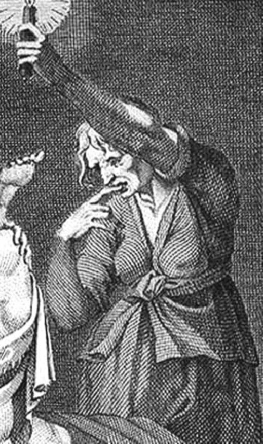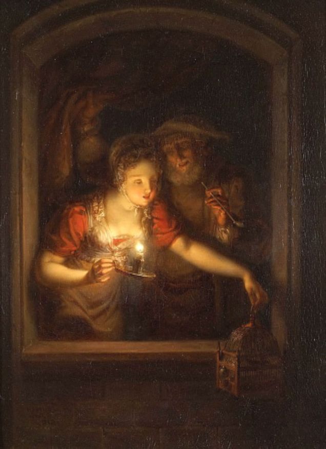А на гравюре итальянца Агостино Караччи дама со свечкой, возможно, просто проявляет любопытство. Сюжет взят из античности – императрица Валерия Мессалина, третья жена Клавдия, проводит время в обществе молодого человека. Наблюдательница наверняка захочет использовать этот факт…