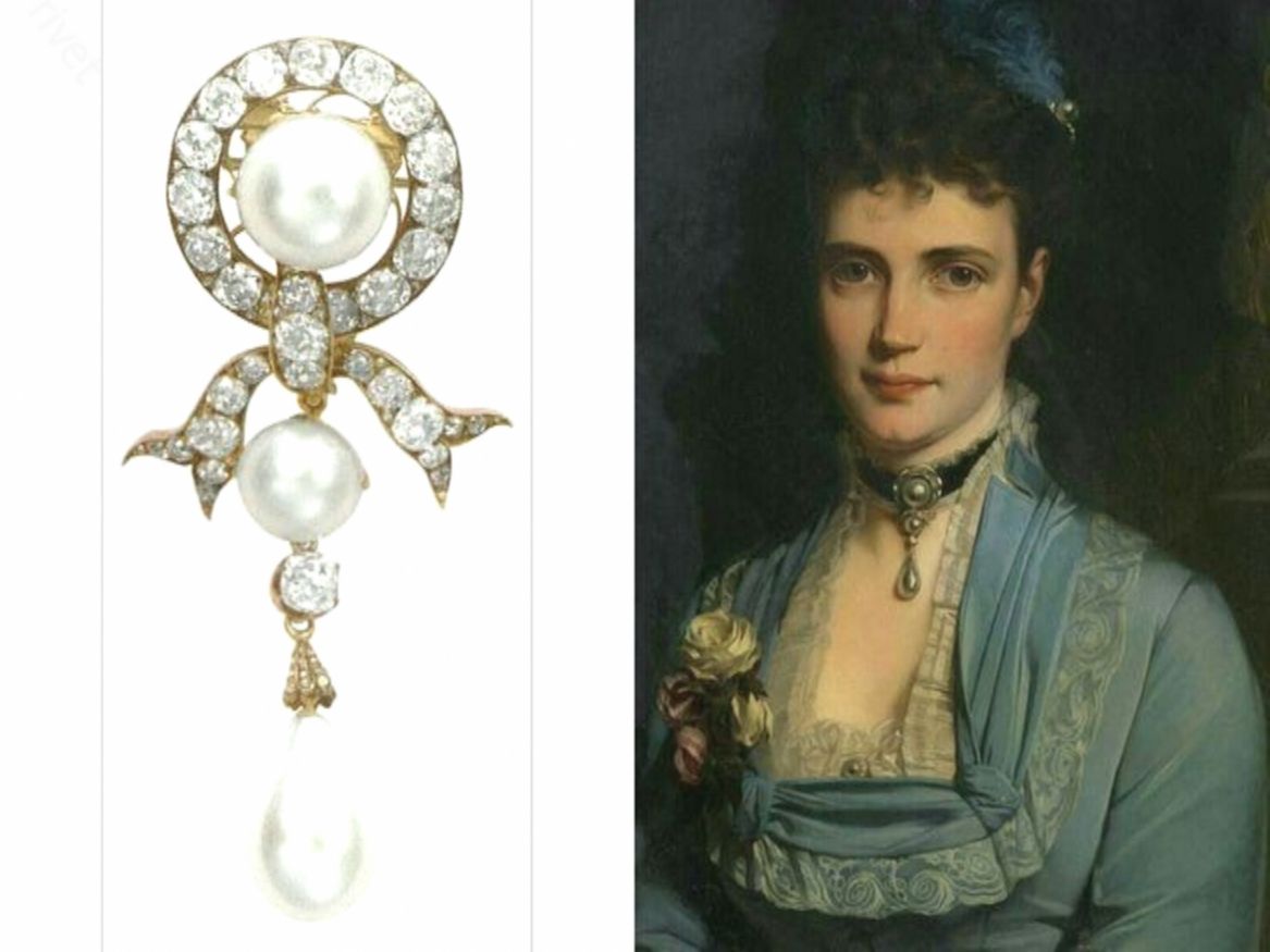 Эта брошь с тремя крупными жемчужинами была подарком Александра Третьего на помолвку с датской принцессой Дагмар и стала любимым украшением императрицы Марии Федоровны. После кончины матери последнего императора России в 1928 году, драгоценности были тайно вывезены из Дании в Англию великой княгиней Ксенией Александровной и постепенно распроданы.