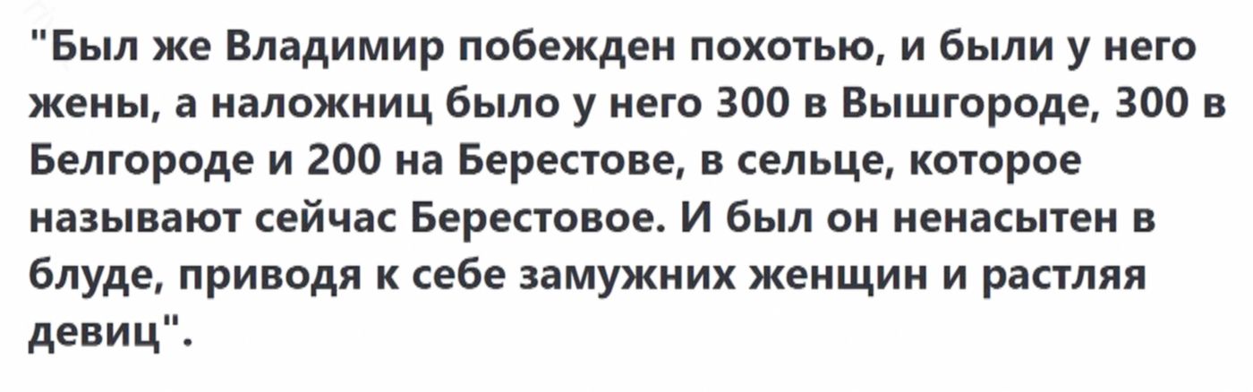 Владимир, после того как отправил жену, зажил, как сказано в «Лаврентьевской летописи», — «блудно». У князя было несколько жён, и, по словам летописца, восемьсот наложниц: