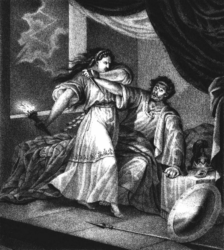Владимир остался на ночь и после супружеских «милостей» крепко уснул. Заметив, что князь заснул, Рогнеда вытащила из-под изголовья (так в старину называли подушку) острый кинжал и набросилась на мужа.