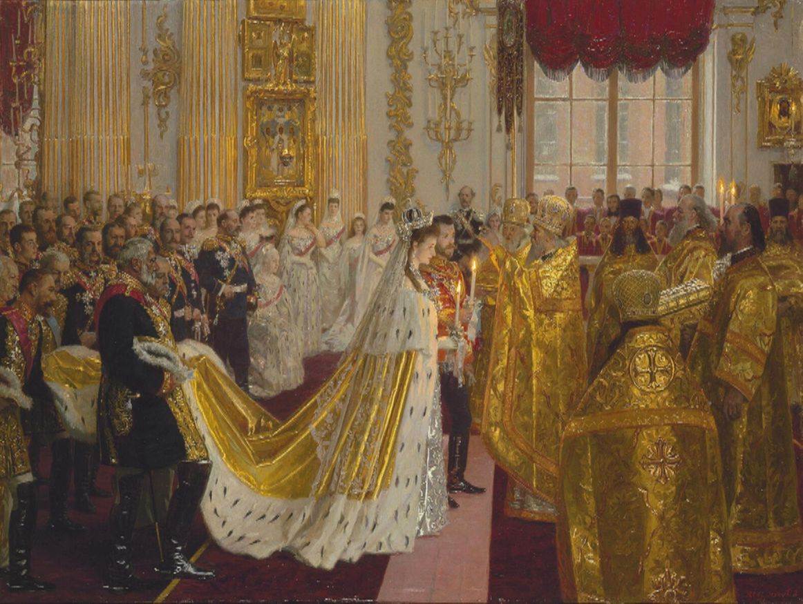 Алиса приняла православие с именем Александры Федоровны. Свадебное платье и императорская мантия были готовы в срок, кружевная фата передавалась по наследству – ее носила на своей свадьбе мать Алисы. Голову девушки венчала Романовская императорская свадебная корона, а ожерелье и серьги были выданы из сокровищницы и вместе весили… 475 каратов!