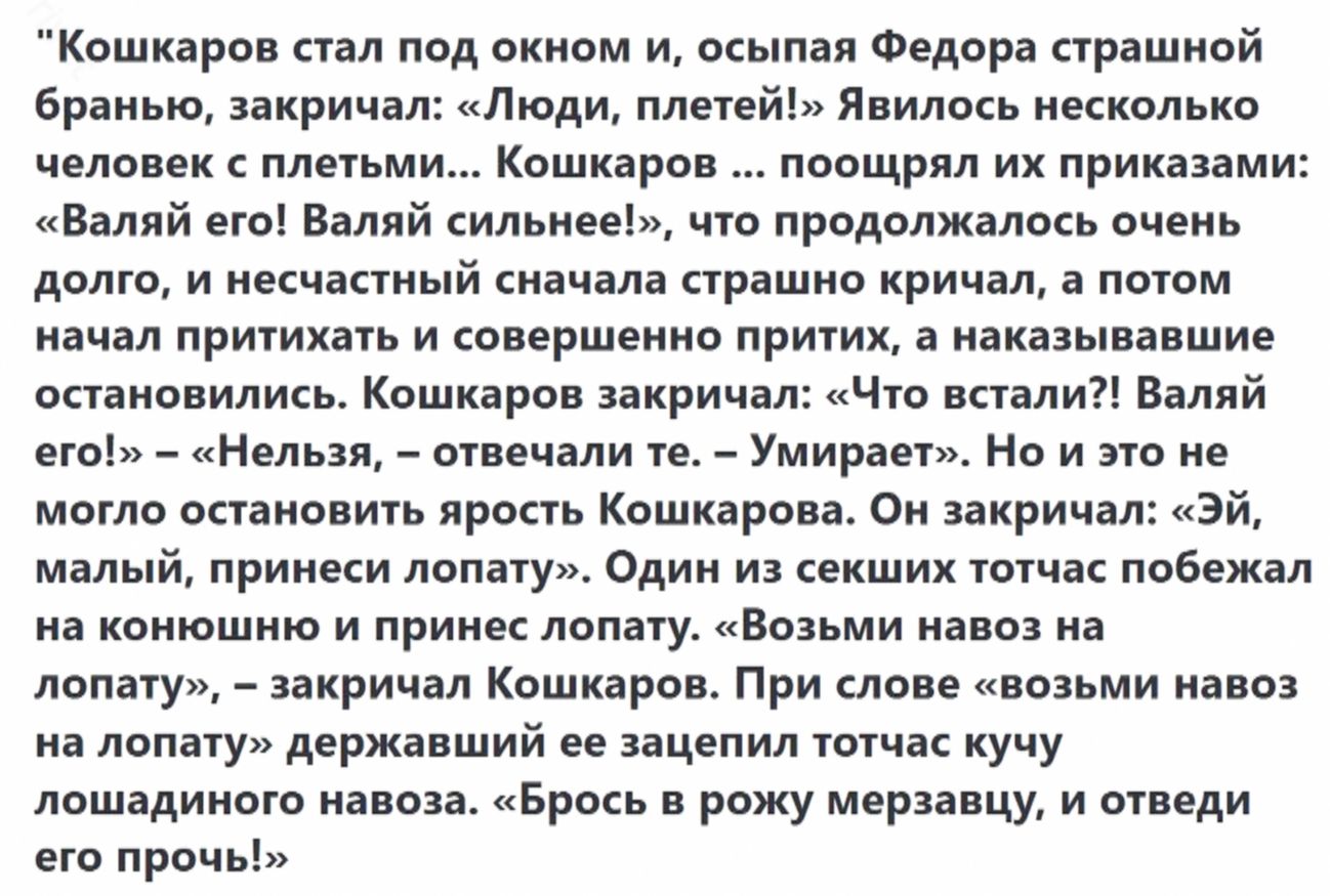 Федору было прекрасно известно о мучениях, которые испытывала Афимья: ранее через гарем Кошкарова прошла сестра конюха.