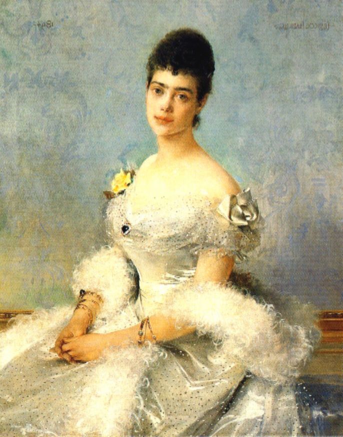 Волосы Ксении были положены длинными локонами, и на голове укреплена очень сложным способом драгоценная корона.