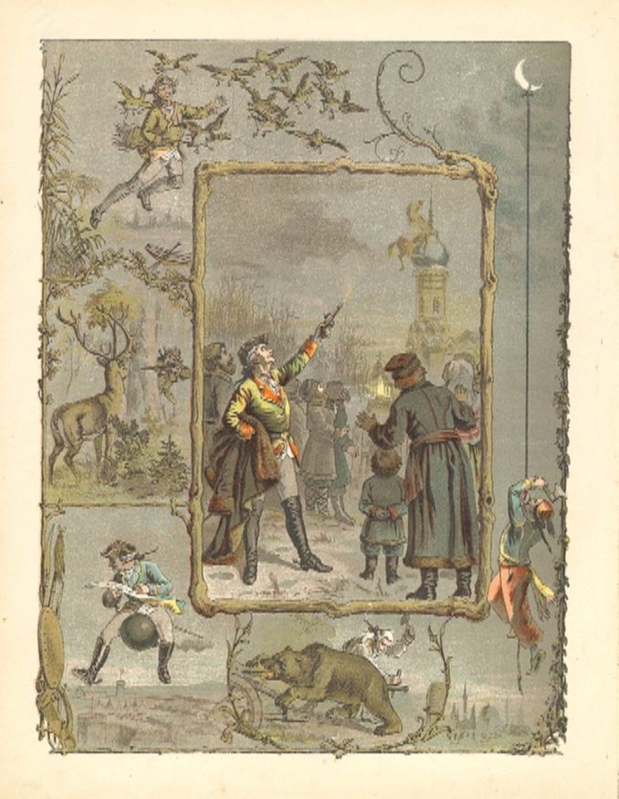 Книга называлась «Удивительные путешествия на суше и на море, военные походы и веселые приключения барона фон Мюнхгаузена, о которых он обычно рассказывает за бутылкой в кругу своих друзей».