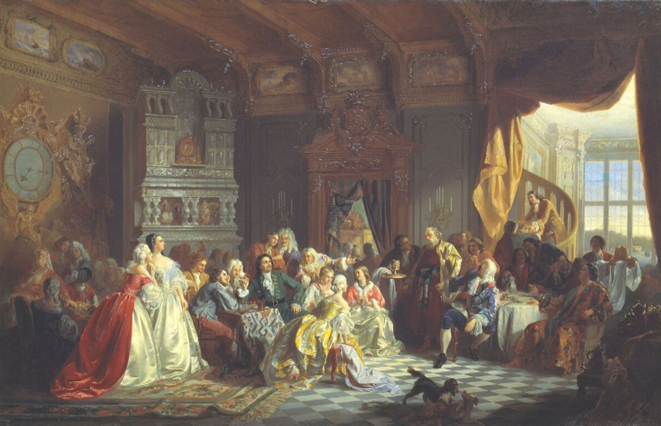 В декабре 1718 года Петр Алексеевич подписал указ об ассамблеях — невиданных доселе развлечениях для представителей высшей аристократии. Предписано было дворянам пить, веселиться, обильно есть разнообразную снедь, беседовать, танцевать, играть в разные игры и наслаждаться музЫкой.