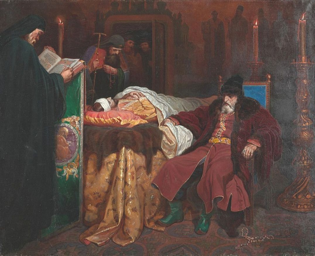 А вот дальше история кажется очень запутанной. Версия популярная – в ноябре 1581 года Иван Грозный зашёл на половину невестки, увидел её неодетой и непричёсанной и осерчал. Махал посохом, молодая женщина упала. Вмешался сын, и принял на себя один из ударов. Результат мы все знаем по знаменитым картинам Репина и Шварца. 19 ноября царевич скончался, не стало и его наследника.