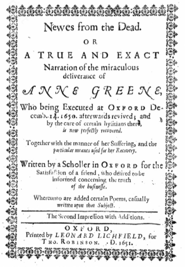 О сенсационном воскрешении Энн Грин в Оксфорде был издан специальный бюллетень под названием «Вести из мертвых»: