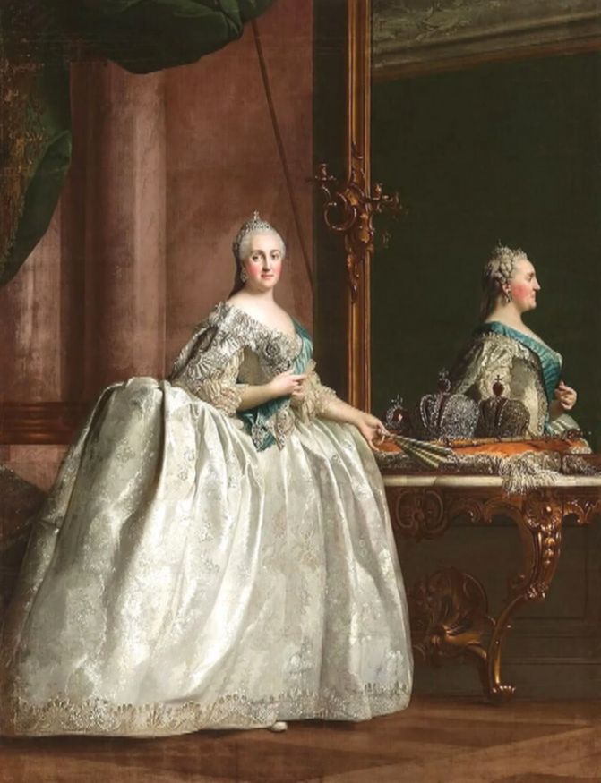 Вещи императрицы подтверждают эти наблюдения. Сохранившиеся в Эрмитаже платья свидетельствуют, что в молодости Екатерина была чрезвычайно миниатюрной: объем талии ее венчального платья составлял всего 51 сантиметр. Однако с возрастом она заметно прибавила в весе, достигая примерно 80 килограммов и 48-го размера одежды. Полноту она искусно скрывала пышными юбками и широкими рукавами, которые подчеркивали ее статус и отвлекали внимание от фигуры.