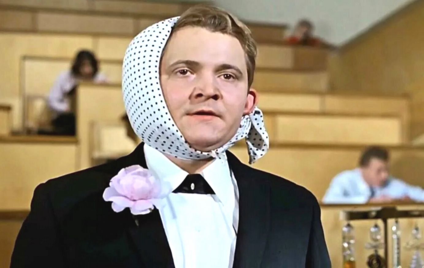 Помните знаменитую мизансцену? Удивленный внешним видом студента с перевязанным ухом и с розой в петлице «профессор» с наивным видом интересуется: