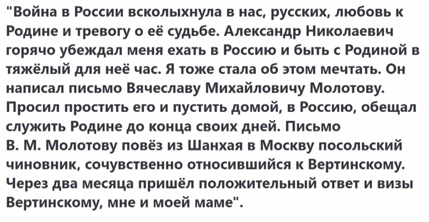 На родине Вертинских встретили с небывалым радушием. Семье предоставили для проживания просторный и комфортабельный номер в гостинице «Метрополь», где они провели последующие три года. Именно сюда, в «Метрополь», счастливый Александр Николаевич 19 декабря 1944 года торжественно внёс на руках свою вторую дочь — Анастасию.